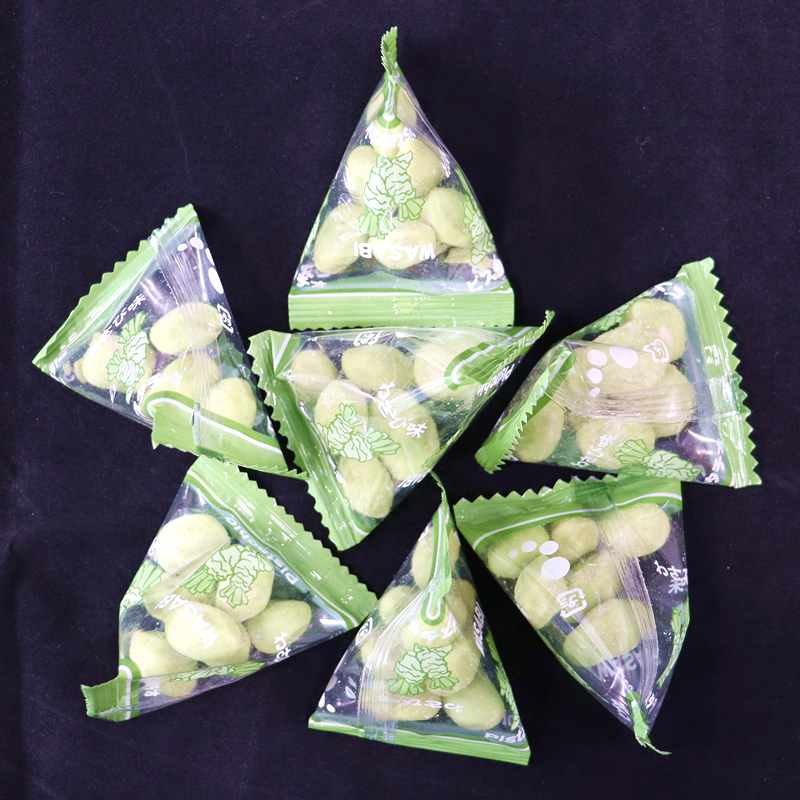 green peas, wheat flour, corn starch, sugar, soy sauce (soybean, wheat, salt), corn syrup, rapeseed oil, Hydrolyzed vegetable protein (soybean), rice flour, salt, pullulan, mustard, Japanese horseradish, dextrin, amino acid (seasoning), baking powder, FD&C blue#1, FD&C yellow#5